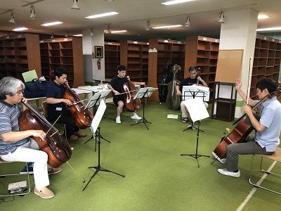 津別町町長、実行委員会の原田会長、ご自身がチェロの受講生でもある伊藤副長町からの挨拶と、実行委員長の長野さんによる日程説明の後、いよいよ合奏です。ブラームス:交響曲第4番の重厚な響きがホールに響きます。ただ、この日も午前中から猛暑日で、冷房設備の無い中央公民館の舞台は「蒸し風呂」状態!予定を変更し、午後から夕食までの13時〜18時は、冷房のある広めの部屋で弦楽器と管楽器&打楽器に分かれての分奏にせざるを得ません(管楽器の分奏は日本フィルOBでフルートの阿部さんが務めて下さいました)。果たして曲が仕上がるのか心配になってきました。