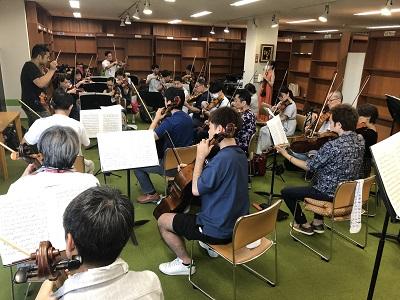 長い練習時間を経て夕食(実行委員会の皆さんの手作りカレーと新鮮野菜のサラダが美味でした!)の後、19時〜21時の合奏では、湿気による弦楽器の「鳴り」の悪さに苦労しながらも集中した演奏で、長い一日が終了です。