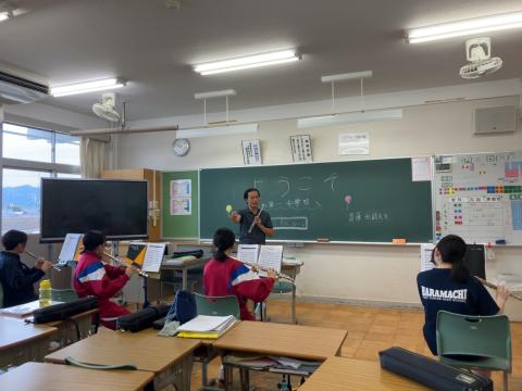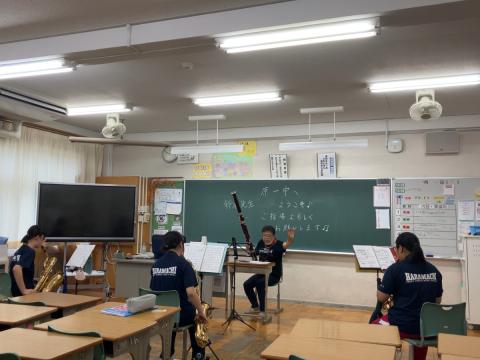 今回は、木管五重奏の楽器(フルート、オーボエ、クラリネット、ファゴット、ホルン)に加え、トロンボーン、パーカッションの楽員が訪問し、指導を行いました。