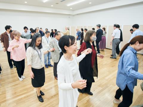 映画「サウンド・オブ・ミュージック」に登場するレントラー曲の演奏に合わせて、楽団員を含む初対面の人同士が対になって手を取り合い、ステップを踏んでは、やや複雑な回転を加えていく。気恥ずかしさもすぐに消え、参加者と奏者がアンサンブルになっていく。いつしか会場は笑い声であふれていた。