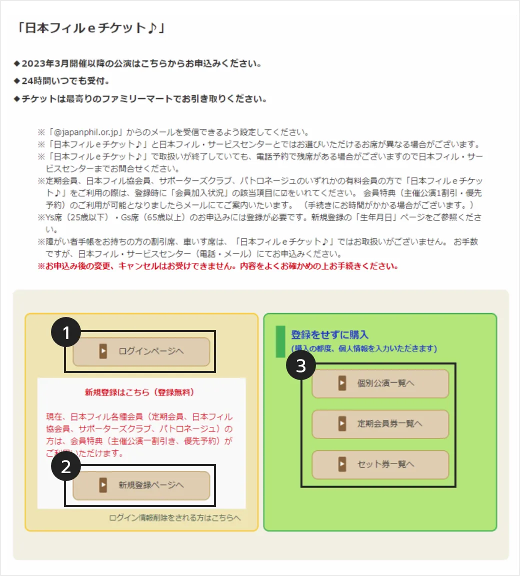 「ログインページへ」ボタン押下し、会員ログイン後、《個別》《定期会員券》《セット券》 を選んで予約ページへ遷移してください。