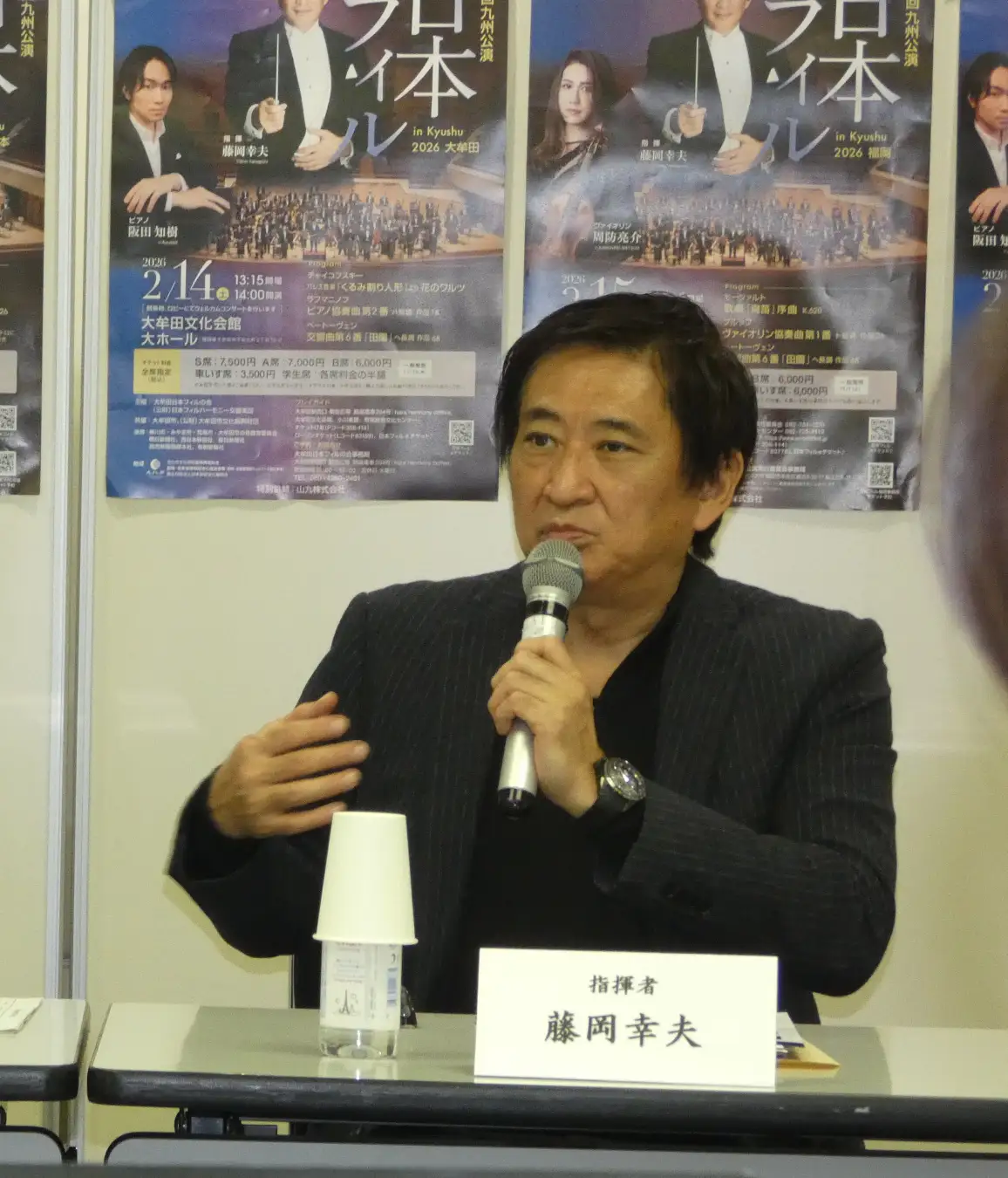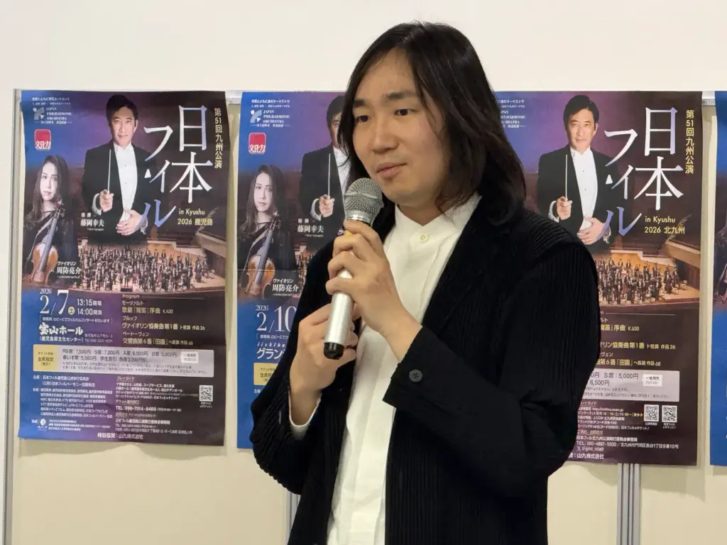 2月の公演に先立ち、12月9日福岡に指揮者の藤岡幸夫、ヴァイオリンの周防亮介、ピアノの阪田知樹が一同に会し、九州公演に寄せる想いや曲目について語りました。