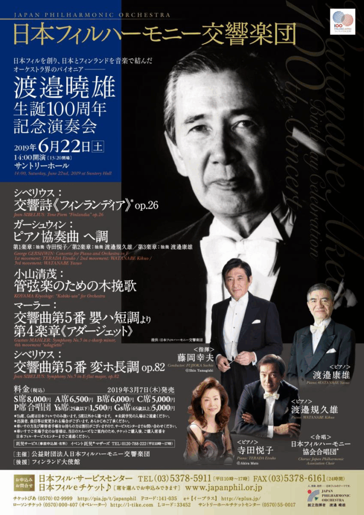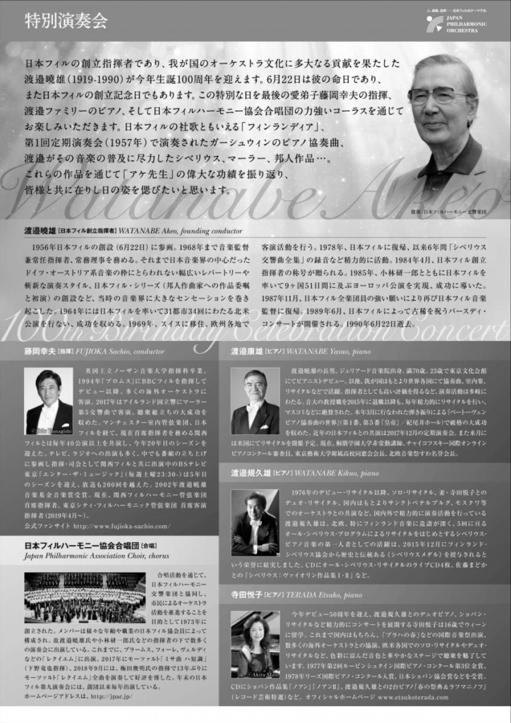 日本フィルの創立指揮者であり、我が国のオーケストラ文化発展に多大なる貢献を果たした渡邉曉雄(1919-1990)が今年生誕100周年を迎えました。6月22日は彼の命日であり、また日本フィルの創立記念日でもあります。 この特別な日を最後の愛弟子藤岡幸夫の指揮、渡邉ファミリーのピアノ、そして日本フィル協会合唱団のコーラスとともに、日本フィルのテーマ曲ともいえる「フィンランディア」、第1回定期演奏会(1957年)で演奏されたガーシュウィンのピアノ協奏曲、渡邉がその音楽の普及に尽力したシベリウス、マーラー、邦人作品を演奏しました。 公演の第1部には、生前ご親交の深かった、上皇上皇后両陛下のご臨席を賜りました。 上皇陛下は学習院中等科ご在学中に渡邉曉雄指揮の演奏会をご鑑賞になったことがあります。また、上皇后陛下は大学生時代から渡邉家とご交流があり、日本フィルハーモニー交響楽団第1回定期演奏会から会員としてご鑑賞になっています。