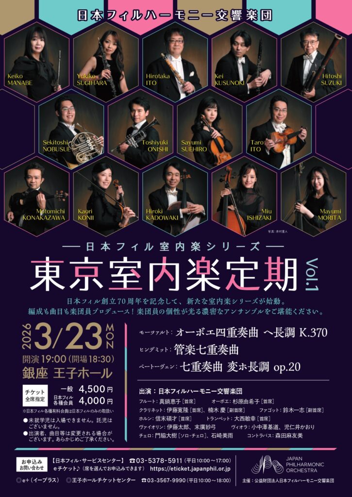 創立70周年を機に、楽団員によるアンサンブルコンサート【東京室内楽定期】を開始いたします。編成も曲目も楽団員プロデュースのこのシリーズは、第1回目は2026年3月に銀座・王子ホールで開催。以降、Vol.2は26年11月、Vol.3は27年3月は銀座・ヤマハホールで開催の予定です。Vol.1ではオーケストラのセクションをまたいだ室内楽のマスターピースを取り上げます。